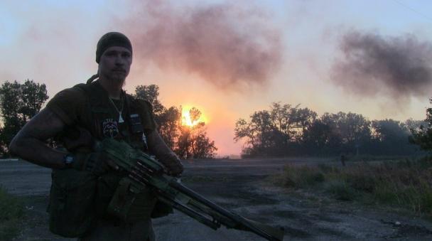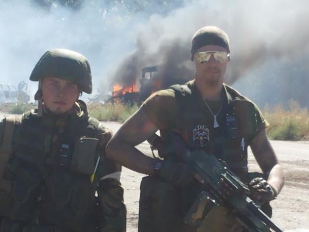 Командири російської неонацистської групи “Русич” Олексій Мільчаков (ліворуч) та Ян Петровський (праворуч) під час засідки на «Айдар» на блокпосту під Цвітними Пісками 5 вересня 2014 року. Фото з соцмереж “Русича”
