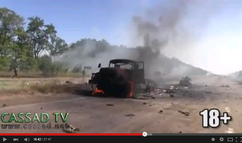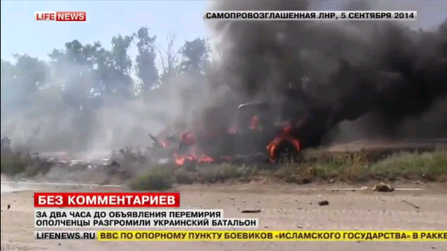 Засідка на «Айдар» на блокпосту під Цвітними Пісками 5 вересня 2014 року. Скріншот з відео російських медіа